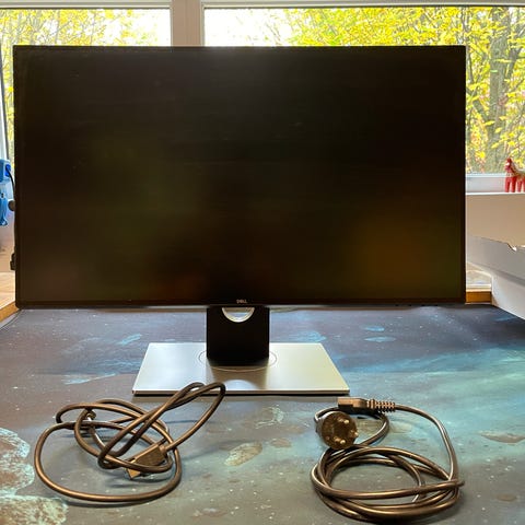Dell, fladskærm, P2720DC, 27 tommer, Med USB-C, så det er muligt at tilslutte laptop og lade samtidig. Småskrammer på fod. Lille sort prik øverst i venstre side.