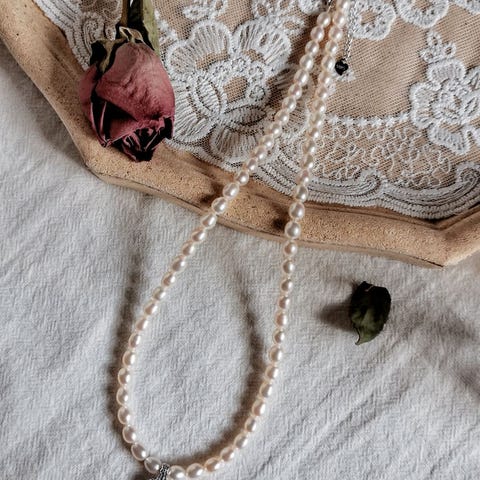 Denne smukke halskæde er sammensat af 3-4 mm Keshi-perler og markante Biwa-perler (staveperler).