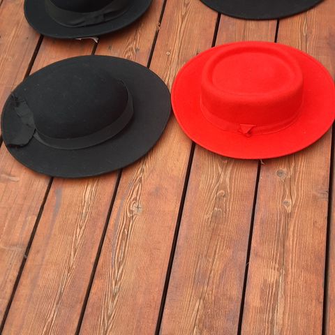 En er lavet af filt, en anden velour og de andre hatte er med stoffer ved jeg ikke hvad de slags er.