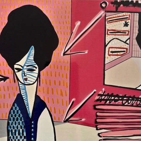 Oliemaleri, Mikala Valeur, motiv: Abstrakt, b: 120 h: 100, Skønt originalt Mikala Valeur maleri fra 2008 med teksten “Pil af pomfrit, kom igen Rosin”.