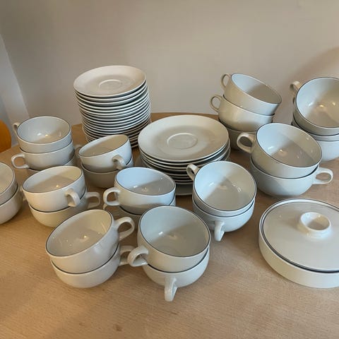 Porcelæn, Kaffekop, underkop og sidetallerken, Royal Copenhagen, Royal Copenhagen Blåkant kaffesæt med kaffekop, underkop og sidetallerken. Fin stand, alle med skår er sorteret fra. Der haves 19 kopper, 11 underkopper og 10 sidetallerkener. Samlet sæt kop, underkop, sidetallerken til 200. Rabat på det hele gives.