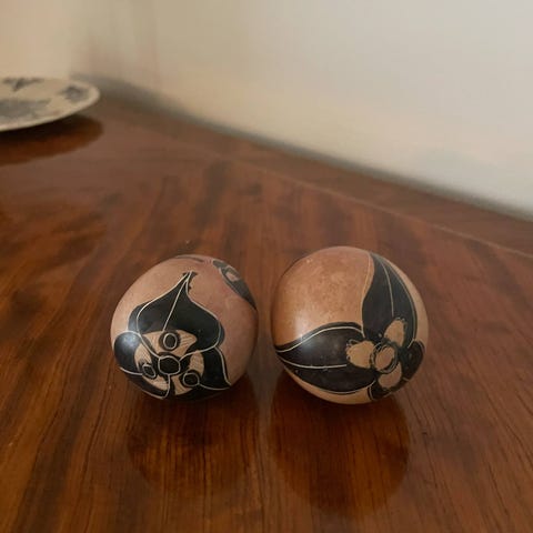 Smukt pynteæg i fedtsten, bund er cremehvid med sort-hvide mønstre.