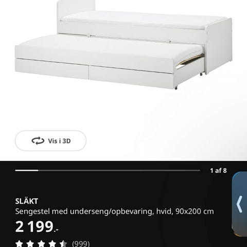 Enkeltseng, IKEA SLÄKT, b: 96 l: 206 h: 78, Denne IKEA SLÄKT senge sælges, da knægten er vokset fra den. Sengen er en enkelt seng, som så kan trækkes ud til 2stk enkelt senge (se billeder). Under udtræksdelen, er der 2 pæne store skuffer til opbevaring, f.eks. ekstra dyne og pude.