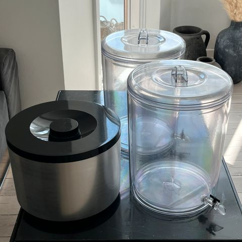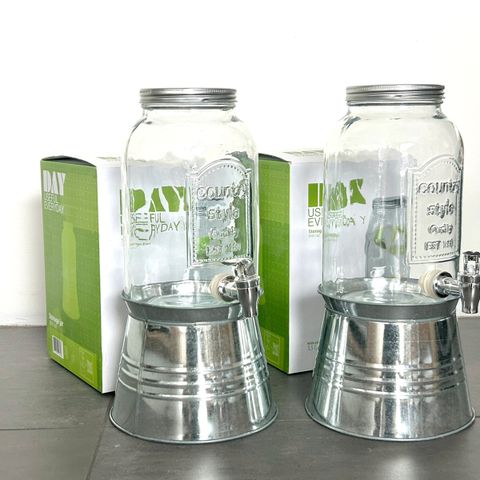 To beholdere dispenser til saft, vand, drinks til studentergilde sommerfest, bryllup, havefest begge i glas med tap, se fotos.