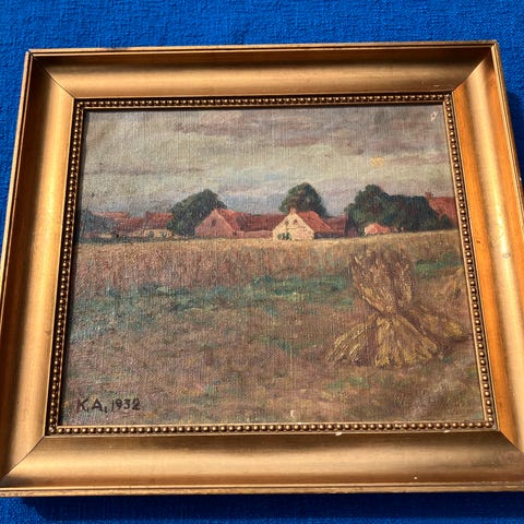 Ældre billede, b: 67 h: 55, Ældre billede i ramme. Efterårsstemningsbillede fra landet med bondehuse, høstakke og en lille kone, der står ved grusvejen. Måske venter hun post vognen, der ses i baggrunden. Tryk på masonit. Bagsiden beklædt med brunt papir. Med ophæng. Signeret, men jeg kan ikke tyde signaturen.
