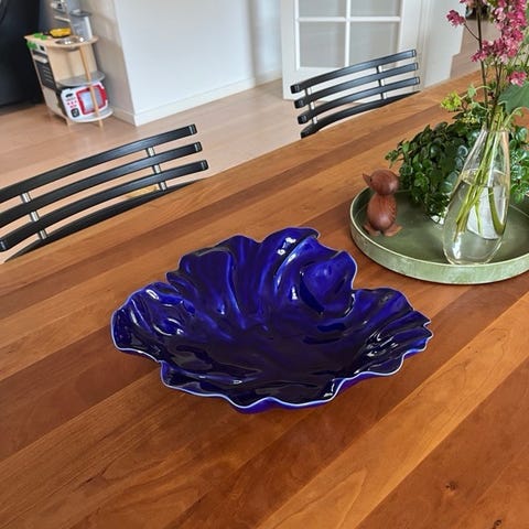 Stort grønt fad, ca 31x33, lille blåt fad Ca 19x19 cm.