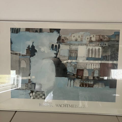 Plaket, Rosina Wachtmeister, motiv: Venedi - gondol/ huse, b: 62,5 h: 94,0, Blå farver med indlagt sølv. Flot! Indrammet i aluminiumsramme med glas Udgået motiv.