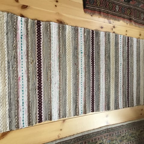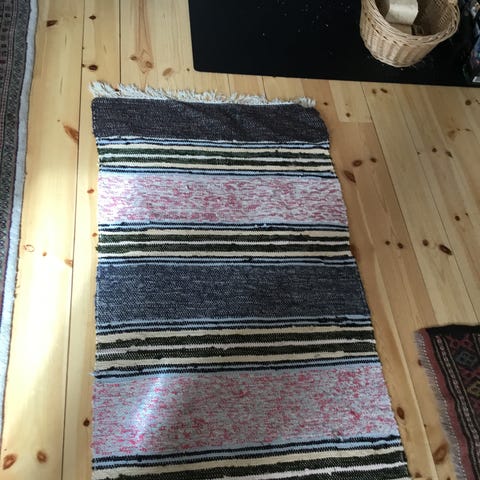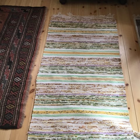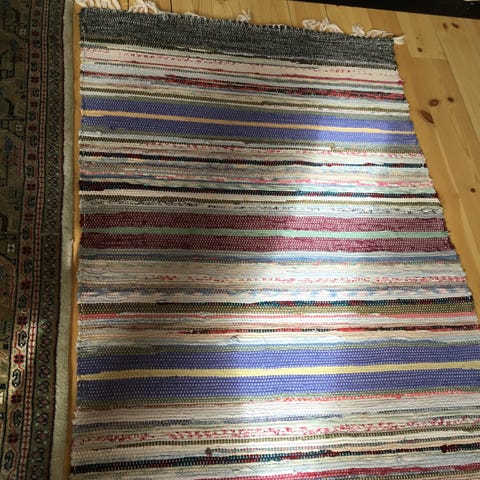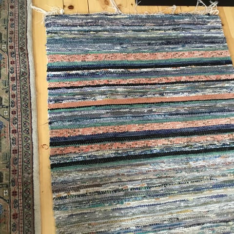Kludetæppe, Bomuld, b: 65 l: 135, Ægte gammelt svensk kludetæppe i en afstemt farvepalet, med både klare og bløde farver.