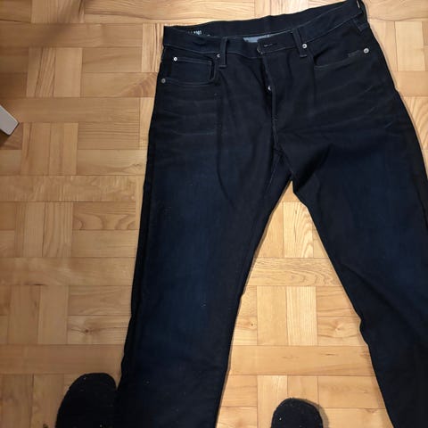 Der står str. W38 L32 i : Livvidde ca. 2 x 52,5 cm, indvendig ben længde ca. 82,5 cm. Mål foran fra linning og ned til skridtet hvor sømmene krydser ca. 27 cm, samme mål men på bagsiden ca. 42 cm
