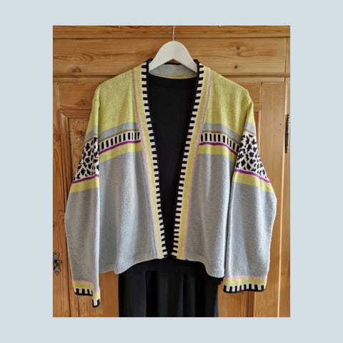 Helt sorte ærmer og ryg i almindelig 'glat' garn, hvorimod for-stykket er af sort/brunt meleret tyk lidt loddent garn. 55% akryl og 45% uld. OBS! Billede 1 er ikke helt rigtig i farven.
