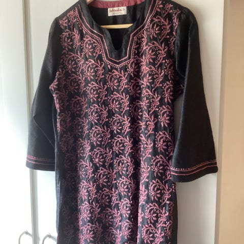 Der står str. S/42/44 i: Længde fra skulder og ned ca. 82 cm, brystvidde ca. 2 x 63 cm.