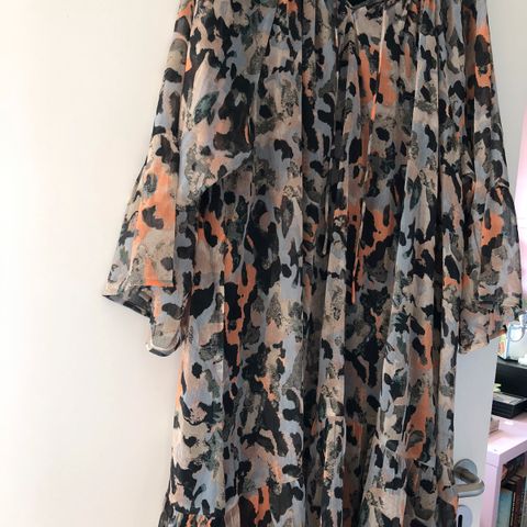 Der står str. M (hvilket svarer til str. 46-48) i : Længde fra skulder og ned ca. 105 cm, brystvidde ca. 2 x 60 cm (målt når den ligger fladt uden at trække i stoffet, men vidden kan sagtens blive større).