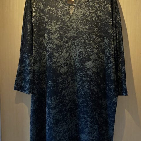 Der står str. XXL i: brystvidde ca. 2 x 57 cm (målt når stoffet ligger helt fladt uden at trække i det), hofte ca. 2 x 61 cm, længde ca. 98,5 cm. Indvendig ærmelængde ca. 30 cm.