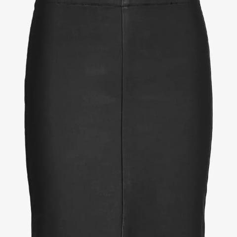 Lidt blankt sort stof. Der er ikke stræk i linning, men der er stræk i resten af nederdelen. Har foer. Lynlåslukning og lille slids midt bagpå.