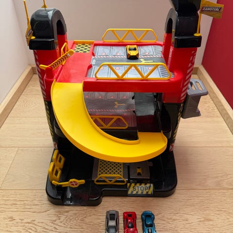 Parkeringshus, Bosch Service, Supersejt parkeringshus i 5 etager med elevator og 2 racerbiler (ikke originale), tankstation med kiosk og bilvask - højde 85 cm - se billeder. Alder fra 3 år.