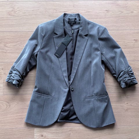 Der står str. 46 i : Brystvidde ca. 2 x 58,5 cm, længde fra skulder og ned 69 cm, indvendig ærmelængde 27 cm.