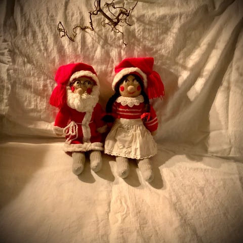 Nissepar med plads til dekoration, Kyssende nissepar med plads til lille potteplante eller dekoration. ca. B 15 x H 15 cm. Nissedrengen står på skammel for at kunne nå:)