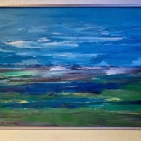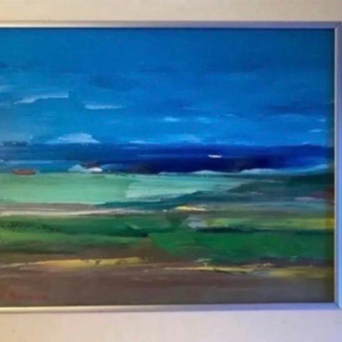 Oliemaleri, b: 90 h: 110, Abstrakt landskabsmaleri / kystparti i dybe blå , grå , grønne og orange nuancer.