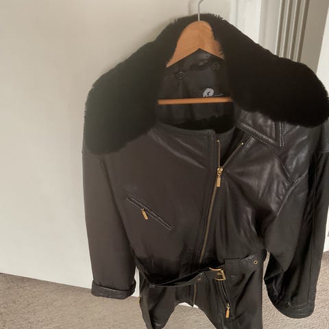 Sort skind / læder samt pelskanter af indfarvet ræv ved lynlås, hætte og ærmer.