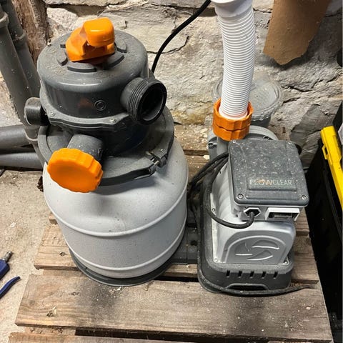 Vi har tilkøbt solceller som kan varme poolen op, vi har haft den op på 27 grader. Vi har også en bedre pumpe med filterkugler som kan købes med. Vi har også et termocover der holder på varmen om natten. Dette kan købes for 1000 kr oveni.