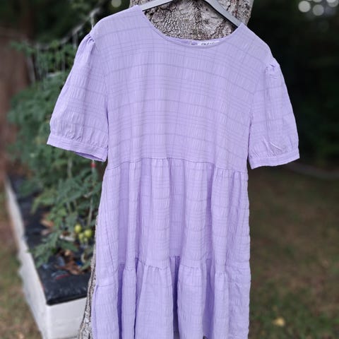 Flot lyseblå blomstret kjole. Knapper i nakken, flot halsudskæring og skjult lynlås i siden. Tynd for i.