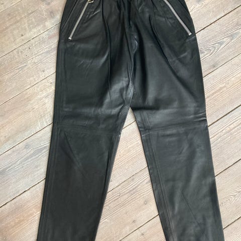 Capri bukser (piratbukser) i blødt sort skind fra Share Female. Måler 2x43 cm i livet og 79 cm i længden. Satinforet er gået lidt i sømmen indeni (se foto) ellers i fin stand.