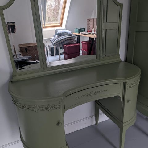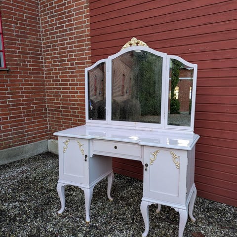Sminkebor med stort spejl, Her sælges et flot afsyret sminkebord med spejl fra omkring 1920-1930. Det er meget flot og i rigtig god stand.