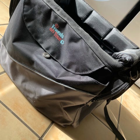 Cykelkurv, cykelkurv/transporttaske, Friends on Tour. sort/grå, slidstærkt nylon, netlomme på siden, stor netlomme med klap foran, indvendig line med karabinhage, reflekser, kan bære op til 7 kg, hanke til at bære. L: 37 x B:26x H: 26 cm, stoffet på forreste venstre hjørne, har trukket sig lidt tilbage, men kan enten limes eller sys, det er kun kosmetisk se foto, ellers er den MEGET VELHOLDT. Sælges for 149 kr. Sender gerne, dog ikke med fiks færdig. porto oveni
