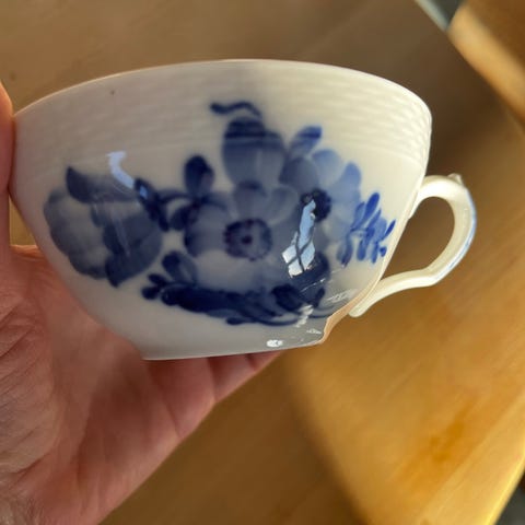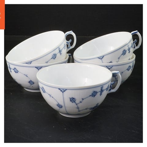 Porcelæn, Tekop, Royal Copenhagen, Royal Copenhagen musselmalet tekopper samt hvid riflet underkop. Prisen er for 4 sæt.