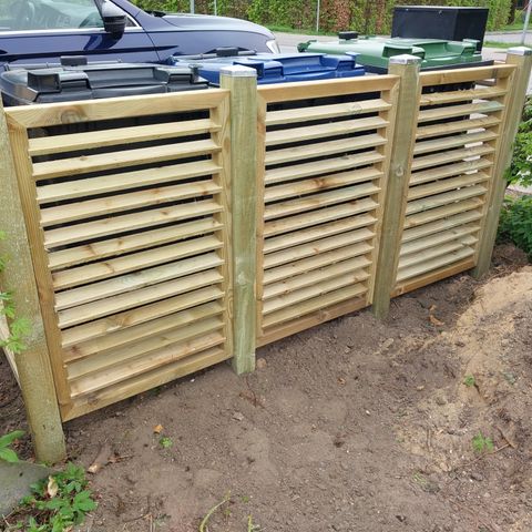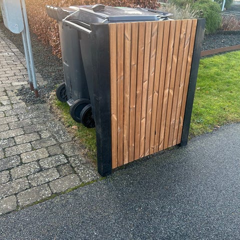 Skraldespandsskjuler, Helt ny skraldespandsskjuler/affaldsskjuler (3x240L) malet i rødbrun (Dyrup dækkende træbeskyttelse). Opgraderet med gaspumper.