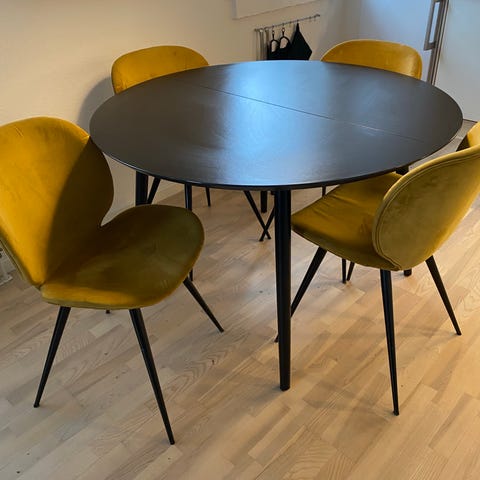 Spisebord m/stole l: 160, Sælger dette fine sæt med 4x velour stole i farve mørkegrøn. Der en smule misfarvning på bord benene men det kan sagtens klares med lidt maling:)