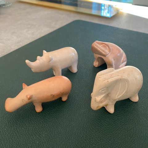 Fedtstensfigurer, Elefant og Vildsvin, 2 fine fedtstenfigurer. Elefanten er 16 cm lang og 11 cm høj. Vægt 985 g. Mærket i panden er ikke en fejl, men en naturlig farveforskel i stenen.