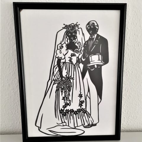 Silhuetklip, Eva Schönberg, Klip indrammet i gammel sort ramme med brugsspor, bagpap lidt bølget, klippet i fin stand. Tryksigneret. 37x29 cm. Forsendelse kan aftales.
