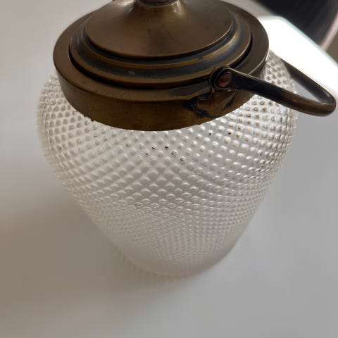 Glas, Kiksespsnd, Ældre kiksespand: dåse Glas med messing låg. H: 15 cm. Med låg 19 cm. Diam 12 cm ved øverste kant. Der er mønster på selve krukken. Små blomster / vinblade pris 125 Kr.