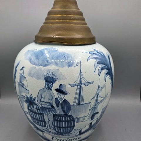 Stor krukke med låg, Delfts blue, En fantastisk gammel tobakskrukke i porcelæn med messing låg. Den er fra midt 70'erne og er fra Hollandske Delfts. Den er håndmalet med den fine blå farve som de er kendt for..