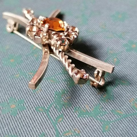 Broche, forgyldt, Aconda, Lidt mindre broche i guld farve og med 6 små krystal sten, lidt slid spor, men den er heller ikke ny mere.