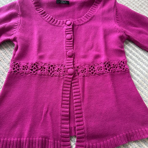 Cardigan, Fair Lady, str. 38, Lyserød, lilla, blå, gul og grøn, Polyester, God men brugt, Smuk retro cardigan med et blomstret motiv i farverne lyserød, lilla, blå, gul og grøn med en fin perle-guldknap.