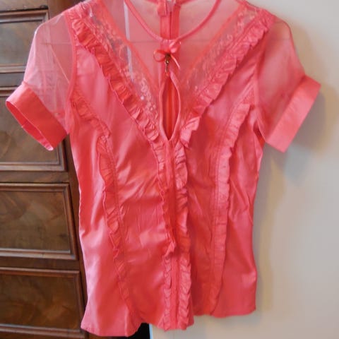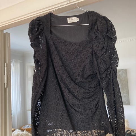 Flot og anderledes støvet lyseblå bluse med trekvart ærmer med skjorteknapning. Blød V-udskæring med knapper. Blondelomme på det ene bryst og ryg i blonde med gennemsigtige palietter.