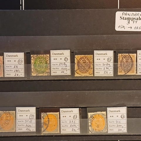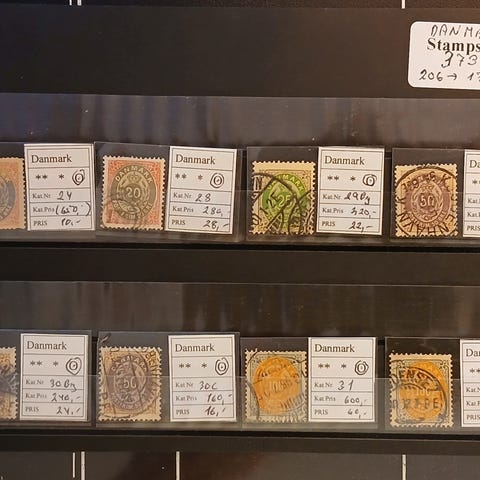 Danmark, stemplet, tofarvede øremærker. 4 plancher med 4 og 8 øre tofarvede i blandet kvalitet. Seriøse bud modtages. Kun afhentning
