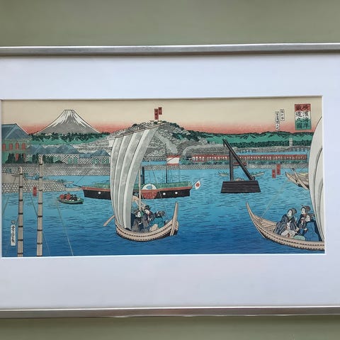 Gouache, japansk , motiv: Landskab, stil: Naturalistisk, b: 97 h: 65, Find Holger! Nu i glas og ramme llge til at hænge op!! Ukiyo-e japansk muligvis træsnit der måler 65 X 97 cm.