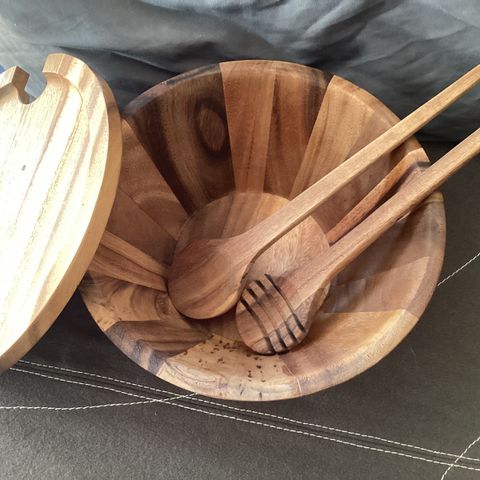 Sælger en smuk træskål i akacietræ, som kommer med både låg og ske. Ideel til servering og opbevaring af madvarer.