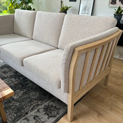Anden arkitekt, tremmesofa, Tremmesofa sælges meget billigt, fordi een af hynderne enten skal ompolstres eller have en grundig rengøring (eller blot skal vendes om, som jeg har gjort). Tror pletten kan fjernes hvis den kommer i kyndige hænder (se foto). Skal afhentes her (1. sal), da jeg har problemer med min ryg, men det er et godt køb... Prisen er lige sat ned og ikke til forhandling.