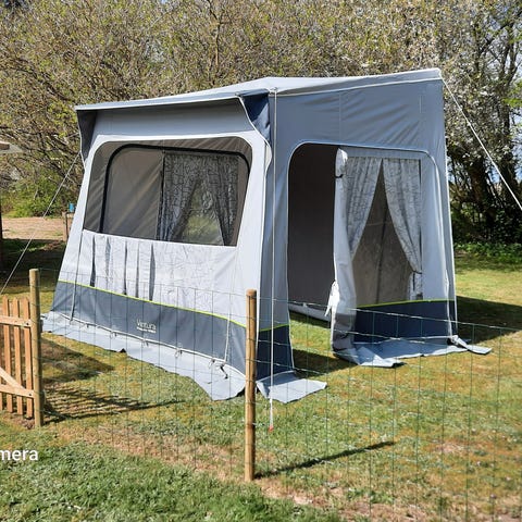 Kan bruges på alle campingvogne med skinnemål i toppen på c 400 cm. Ikke nødvendigt lodret da siderne står op ad campingvognen.