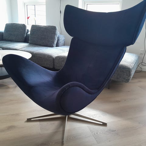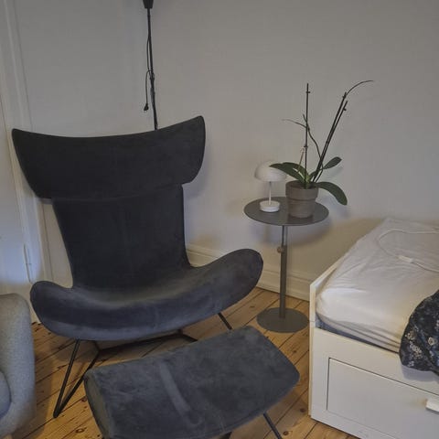 IMOLA stol - designet af Henrik Pedersen. - købt privat for et par år siden - men nu syntes vi at den skal videre til en anden familie - fantastisk putte stol - grøn uld stof - fejler absolut intet...