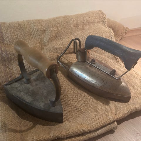 Antikke strygejern, Ukendt, Fire meget, meget gamle og meget unikke strygejern, som har stået ved mine forældres brændeovn, og til pynt ved en gammel kakkelovn.