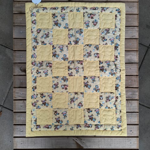 Håndsyet quilt, Tæppet har en håndsyet forside og er maskinquiltet. Kant og bagsidestof er ens
