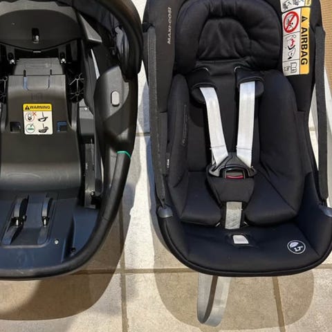 Kvittering haves på basen, autostolen er købt brugt. Har ikke været ude for uheld. Det er et godt setup hvor basen gør det muligt at dreje og trække autostolen en smule tættere på døren, så det er lettere montere baby i bilen. Inderskal i autostolen kan tages ud, hvilket jeg har brugt meget med tvillinger. Der er stor kaleche som giver god skygge for solen. Babyindsats medfølger selvfølgelig. Det hele er i fin stand. Base og autostol sælges helst sammen.