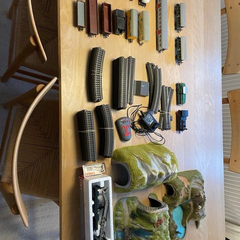 Modeltog, Märklin, Masser af skinner, huse og andre smådele sælges samlet. Togene trænger til renovering.