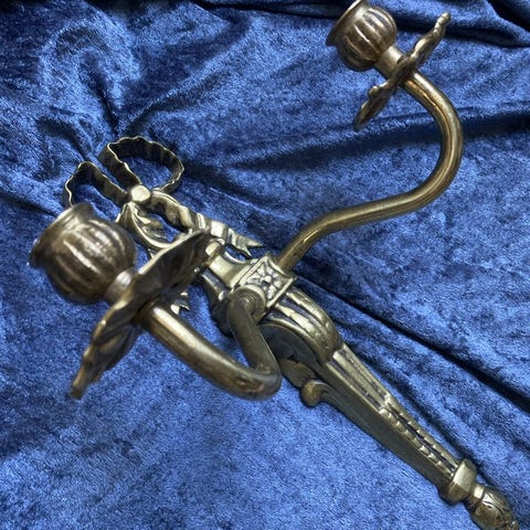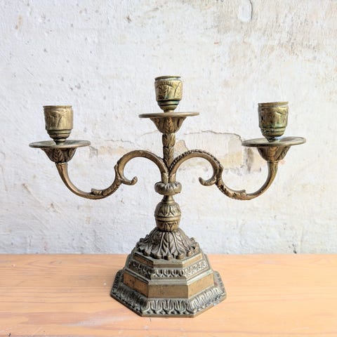 Andet, Lysestage, Lysestage, 3 armet messinglysestage. Kandelaber. Fantastisk flot og dekorativ i romantisk stil. H. 36 cm. B. 29 cm.