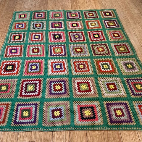 Retro hjem, oldemor firkanter, oldemortæppe, hæklet tæppe, genbrug, retrofund, genbrugshjem, loppefund, boligindretning.